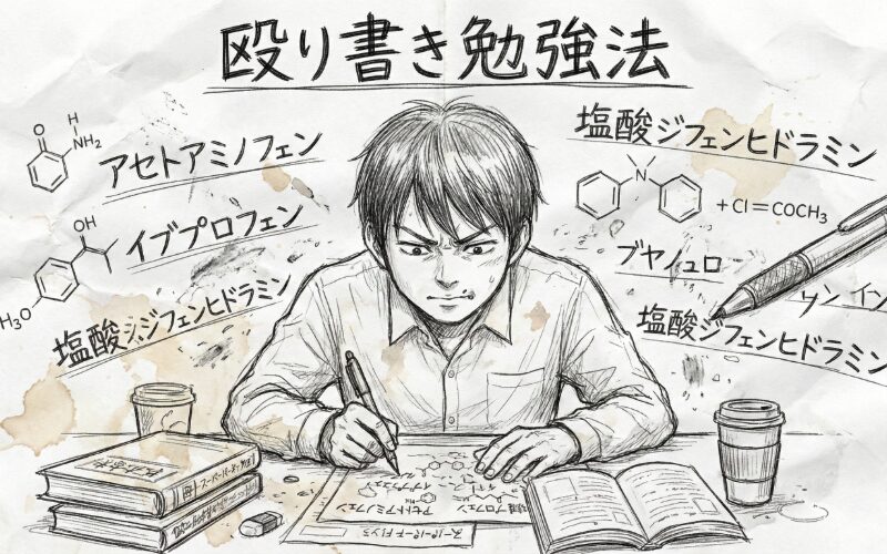 これまでに何度も間違えた問題、どうしても覚えられない成分名だけを、A4用紙1枚に殴り書きします。
