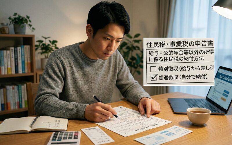 副業収入が年間20万円を超える場合、翌年の2月16日~3月15日に確定申告を行う必要があります。この確定申告の書類の中に、住民税の納付方法を選択する欄があります。