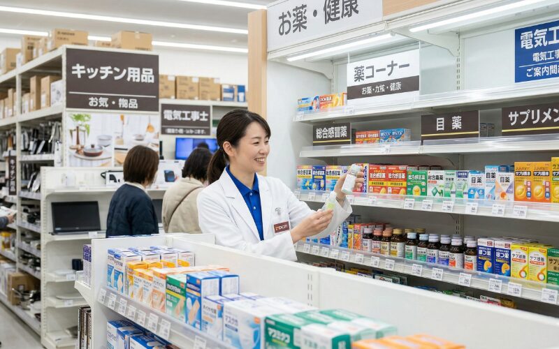 意外に思われるかもしれませんが、大型家電量販店(ヨドバシカメラ・ビックカメラなど)や大手ホームセンター(コーナン・カインズ・ニトリなど)の多くが、医薬品売場を併設しています。これらの店舗では登録販売者が必要なため、週末だけの資格者を積極的に募集しているケースがあります。