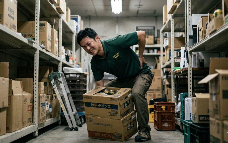 飲料ケース・洗剤・紙おむつ・ペットボトルのまとめ買い——こうした重量物の品出しを毎日繰り返すことで、腰への負担が慢性的に蓄積されます。椎間板ヘルニアや慢性腰痛に発展するケースも珍しくありません。